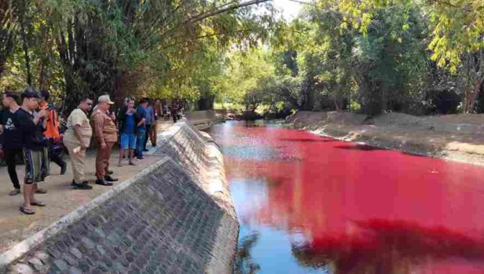 Pamekasan – Penyebab penampakan air sungai di Kabupaten Pamekasan, Madura, Jawa timur, Selasa (11/07/2023) yang berubah menjadi warna merah darah akibat limbah bahan kimia pewarna pembuatan batik di wilayah setempat.