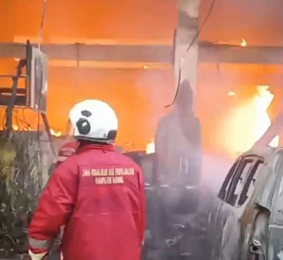 Asap tebal tampak mengepul dari arah dalam bangunan di lantai dua dan tiga, sementara lantai dasar sudah dalam keadaan ludes. Kondisi tragis ini juga melibatkan kerugian lainnya, dengan beberapa furnitur yang sudah ludes menjadi abu dan satu unit mobil yang juga terbakar.