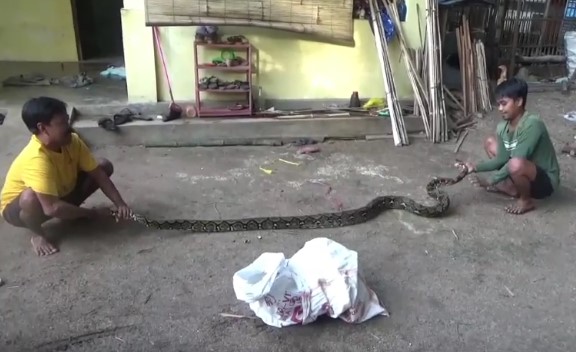 Ular yang juga dikenal sebagai sanca kembang ini tampak berusaha menggeliat dan melawan, namun kekuatannya tak mampu mengalahkan tenaga tiga orang dewasa yang menangkapnya.