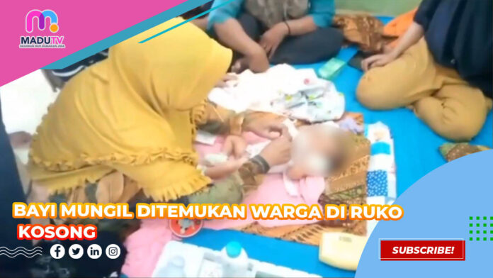berada di depan ruko kosong dalam kondisi sedang menangis dan berselimut kain coklat serta di bekali perlengkapan bayi .