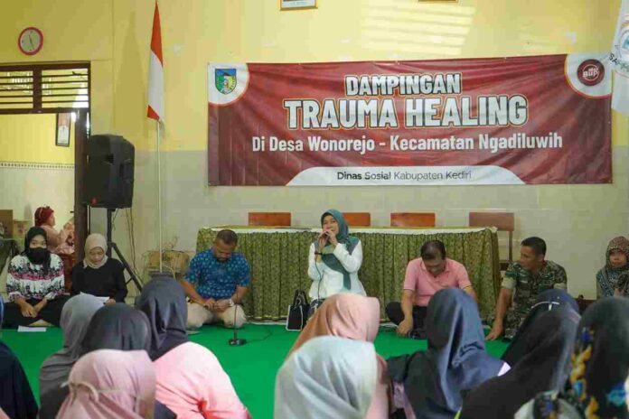 Setidaknya terdapat puluhan warga yang masih mengalami trauma dikumpulkan di Balai Desa Wonorejo. Dalam pendampingan trauma healing ini, Dinas Sosial Kabupaten Kediri menggandeng kalangan akademisi dari program studi psikologi Islam, IAIN Kediri.