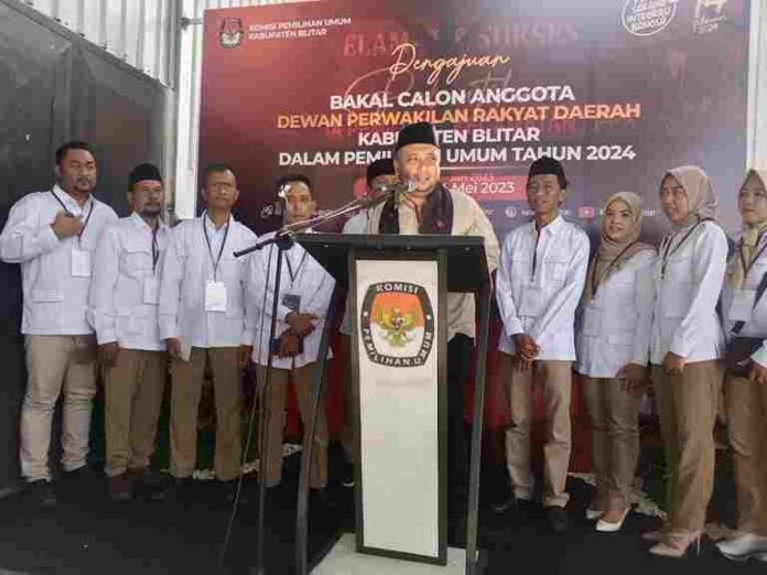BLITAR – Dengan diiringi tarian Barongsai, Partai Gerindra, mendaftarkan bacaleg nya di Kantor KPU Kabupaten Blitar, Sabtu (13/5/2023).