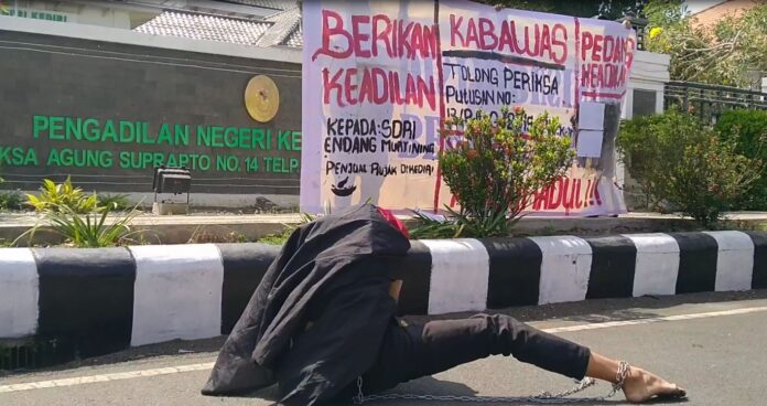 Kediri – Hari ini, di depan Kantor Pengadilan Negeri Kota Kediri, aksi teatrikal yang menarik perhatian masyarakat dan media dilakukan oleh keluarga Endang Murtiningrum, warga Kelurahan Singonegaran, Kecamatan Kota, Kota Kediri. Aksi ini merupakan bentuk protes mereka terhadap putusan kontroversial Pengadilan Negeri Kota Kediri yang telah mengesekusi rumah dan lahan yang selama ini ditempati oleh Endang dan keluarganya.