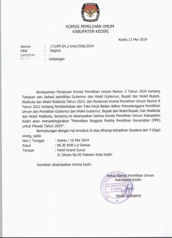 KEDIRI, MADUTV – Dengan Dalih karena Anggaran Komisi Pemilihan Umum Kabupaten Kediri melakukan setiap Tahapan Pemilihan Kepala Daerah Gubernur dan Wakil Gubernur, Bupati dan Wakil Bupati Kediri dengan menerbitkan Surat Resmi dalam bentuk Undangan ke Sejumlah Pihak untuk mengikuti kegiatan Tahapan Sosialisasi yang sudah ditetapkan KPU.