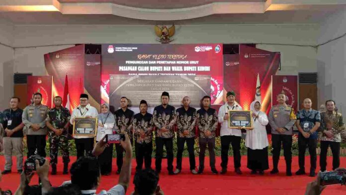 KEDIRI, MADUTV – KPU Kabupaten Kediri menggelar pengundian nomor urut untuk pasangan calon Bupati dan Wakil Bupati Kediri dalam Pilkada 2024 di Gedung Bagawanta Bhari pada Senin malam (23/8/2024).