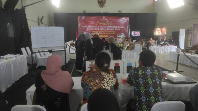 Kediri– Komisi Pemilihan Umum (KPU) Kota Kediri melakukan simulasi pemungutan dan penghitungan suara untuk Pemilu 2024, hari Selasa (30/1/204). KPU juga langsung mengawasi proses kerja atau tugas KPPS yang ada di TPS 20 Semampir.
