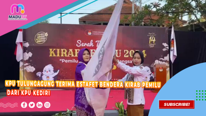 Tulungagung – Penerimaan Bendera Kirab Pemilu 2024 dari KPU Kota Kediri kepada KPU Kabupaten Tulungagung berlangsung meriah. Kedatangan Ketua KPU Kota Kediri, Pusporini Endah Palupi, disambut langsung oleh Ketua KPU Kabupaten Tulungagung, Susanah.