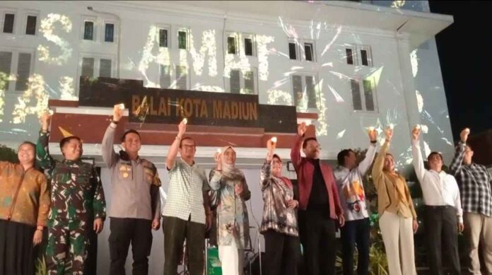 MADUTV, MADIUN– Perayaan malam pergantian Tahun Baru 2026 di Kota Madiun berlangsung semarak melalui acara bertajuk Madiun Berkilau, yang digelar di halaman Balai Kota Madiun, Selasa malam (31/12/2025). Kegiatan ini menyuguhkan beragam pertunjukan seni hingga video mapping spektakuler yang diproyeksikan pada dinding Gedung Balai Kota Madiun dan disaksikan ribuan warga.