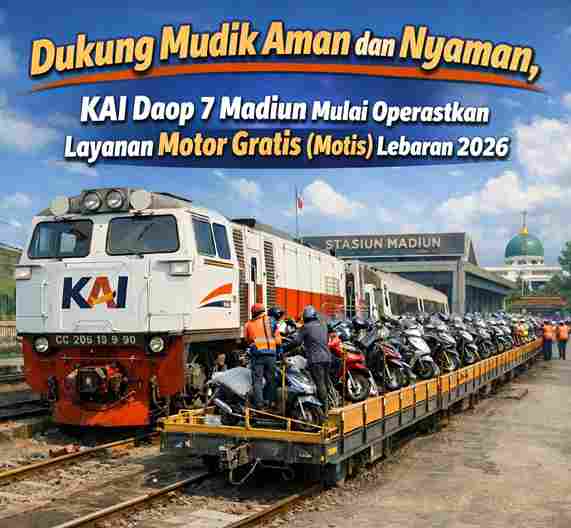 MADIUN, MADUTV – Dalam rangka mendukung kelancaran arus mudik Lebaran 2026, PT Kereta Api Indonesia (Persero) Daerah Operasi 7 Madiun kembali mengoperasikan layanan Motor Gratis (Motis). Program ini menjadi solusi bagi masyarakat yang ingin membawa sepeda motor ke kampung halaman tanpa harus mengendarainya dalam perjalanan jarak jauh.