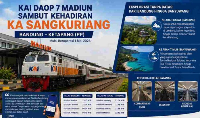 MADIUN, MADUTV – PT Kereta Api Indonesia (Persero) Daerah Operasi 7 Madiun menyambut baik rencana peluncuran KA Sangkuriang rute Bandung–Ketapang (PP) yang mulai beroperasi pada 1 Mei 2026. Kehadiran kereta api baru ini diharapkan menjadi angin segar bagi masyarakat di wilayah Daop 7 Madiun yang ingin merencanakan perjalanan healing, eksplorasi kuliner, maupun mengunjungi destinasi wisata menarik di ujung barat maupun ujung timur Pulau Jawa, serta sebaliknya.