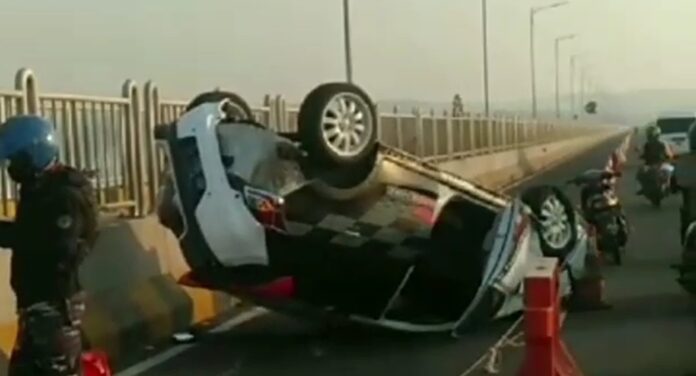 Bangkalan – Sebuah kecelakaan lalu lintas terjadi di kilometer 400 Tol Jembatan Penghubung Madura Surabaya atau yang lebih dikenal dengan Suramadu. Sebuah kendaraan jenis minibus dengan nomor polisi L 1796 AAF diketahui terguling hingga menjadi tontonan warga pengguna jalur jembatan.