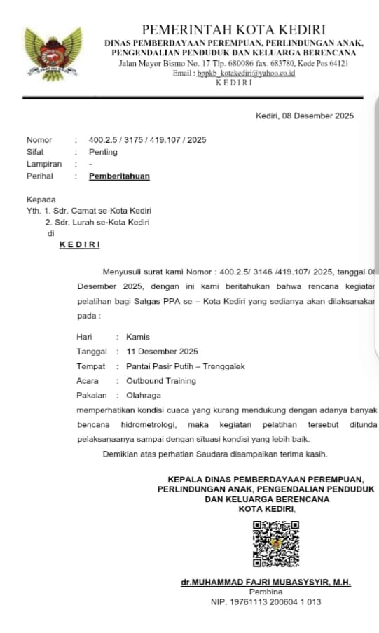 Dalam isi surat itu kegiatan outbond Satgas PPA dibatalkan atas dasar banyak pertimbangan terutama cuaca ekstrem dan banyak terjadinya bencana hidrometologi. Dengan mengirim surat susulan ke seluruh Camat dan Lurah Kota Kediri.
