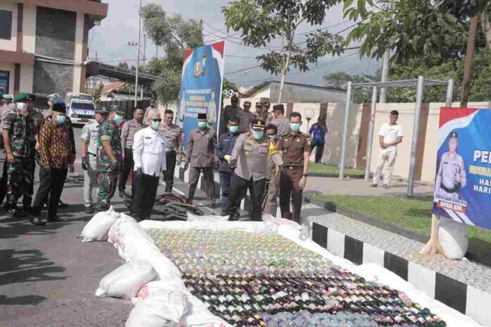 Sebagai bentuk komitmen penegakan hukum, Polres Blitar memusnahkan 3.141 botol minuman beralkohol ilegal, terdiri dari 2.547 botol arak, 96 botol anggur merah, 176 botol merek TM, 153 botol merek Bintang Kuntul, 82 botol merek Vodka, dan 87 botol merek Iceland, serta 52 unit knalpot brong.