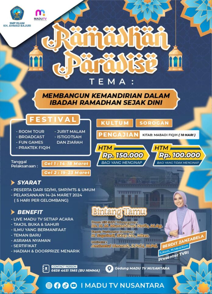 Dalam rangka mempersiapkan diri menyambut bulan suci Ramadhan, Yayasan KH Ahmad Badjuri Sinergi dengan Madutv Nusantara menggelar kegiatan spesial yang tak kalah istimewa, yaitu “Ramadhan Paradise”. Acara ini diselenggarakan dengan kolaborasi yang luar biasa antara siaran teresterial Madutv Nusantara di Surabaya, Kediri, dan Tulungagung, serta melalui platform Telkom 4 di wilayah Asia Tenggara.