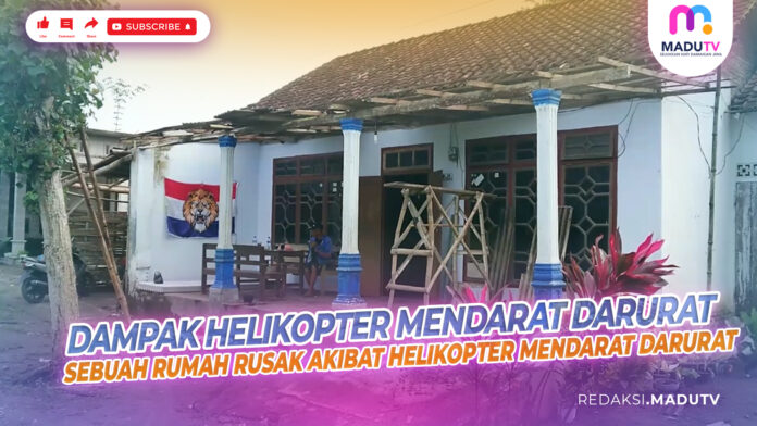 Tulungagung – Beginilah kondisi rumah Bardo, warga Desa Rejotangan, Kecamatan Rejotangan, Kabupaten Tulungagung. Bagian atap teras rumah dan garasi mengalami kerusakan akibat peristiwa pendaratan darurat helikopter, yang ditumpangi Kapolda Jawa Timur, Irjen Pol Toni Harmanto. Helikopter tersebut terpaksa mendarat darurat di sebuah lapangan, karena faktor cuaca buruk. Kapolda lalu melanjutkan perjalanan melalui jalur darat.