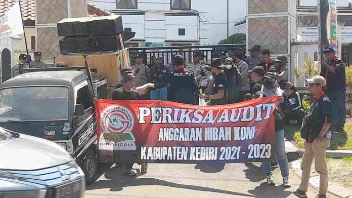 Kedatangan massa agar Kejari Kabupaten Kediri untuk melakukan audit anggaran hibah KONI Kabupaten Kediri tahun anggaran 2021 – 2023. masa menilai KONI tidak terbuka dalam penggunaan anggaran hibah tersebut.