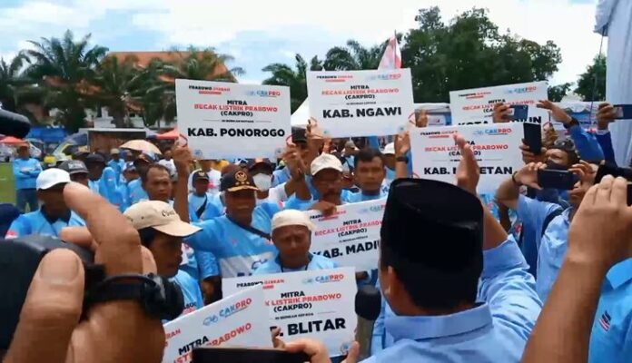 Deklarasi dukungan bagi pasangan calon nomor urut 02 terus mengalir di berbagai daerah, seperti di Madiun, Jawa Timur. Ratusan penarik beca dari tujuh kabupaten/kota di Jawa Timur berkumpul di Lapangan Gulun, Kota Madiun, pada Senin, 29/01/24.