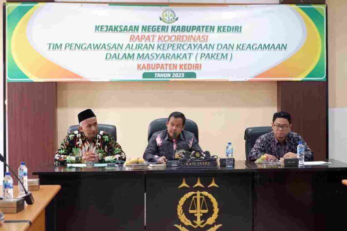 KEDIRI – Kejaksaan Negeri Kabupaten Kediri, Dalam rangka peran dan fungsi Kejaksaan Negeri (Kejari) Kabupaten Kediri dalam menjaga ketertiban dan ketentraman umum terhadap aliran kepercayaan yang dapat membahayakan masyarakat dan negara serta mencagah penyalahgunaan dan/atau penodaan agama di wilayah hukum Kabupaten Kediri, Kejari Kabupaten Kediri selenggarakan kegiatan Rapat Koordinasi (Rakor) Tim Pengawasan Aliran Kepercayaan dan Keagamaan dalam Masyarakat (Pakem) Kabupaten Kediri, Jumat (3/02/2023).